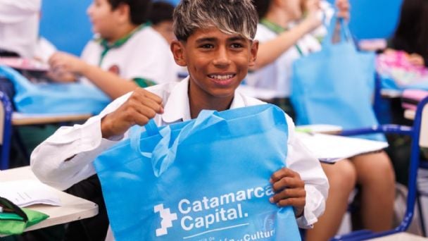 El intendente de la Capital, Gustavo Saadi, junto a autoridades educativas, recorrió las escuelas municipales para concretar una nueva entrega de kits escolares y libros de inglés destinados, por primera vez, a los alumnos de todos los niveles del Sistema Educativo Municipal (SEM).