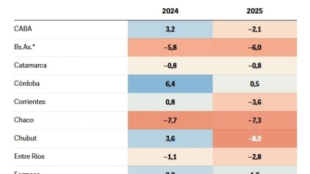 Sin perjuicio de eso, hubo un reducido grupo de provincias que ya venían con saldo negativo. Además de Catamarca con déficit en sus cuentas, aparece la provincia de Buenos Aires, que pasó de -5,8% en 2024 a -6,0% en 2025; el Chaco, que del -7,7% en 2024 mejoró levemente a un -7,3% el año pasado y, Entre Ríos, donde se profundizó el déficit en dos años: del -1,1% al -2,8%.