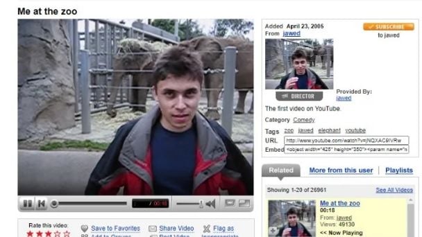 2005 – ME AT THE ZOO. Se publica el primer video en Youtube, la plataforma audiovisual más grande del mundo. Filmado en la ciudad de San Diego (California, EEUU) con una duración de 19 segundos, fue publicado por el usuario Jawed con el título Me at the zoo (Yo en el zoológico). El autor es Jawed Karim, uno de los tres fundadores de la plataforma que además es el segundo buscador más popular del mundo detrás de Google, su actual propietario.